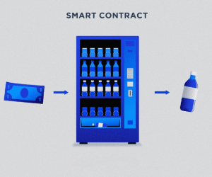 The contract (the machine) holds the items, displays the prices, and executes the exchange automatically when conditions are met.